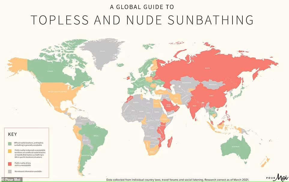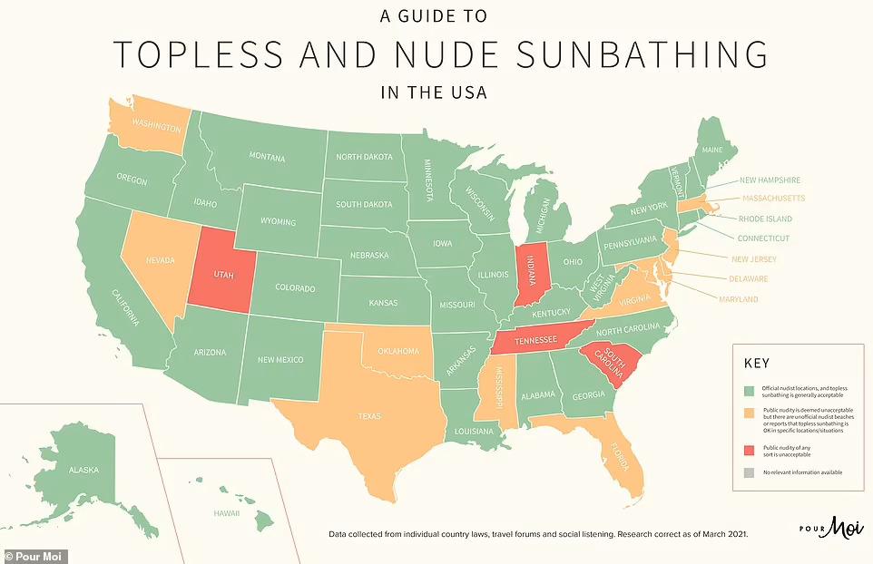 Chiar dacă 2020 n-a fost anul călătoriilor, ci mai degrabă al carantinei, al țărilor închise și al interdicțiilor de călătorie, oamenii au căutat de 10,7 milioane de ori pe Google cuvintele cheie „nude beach" (plajă pentru nudiști) sau „nude resort" (stațiune pentru nudiști) – scrie în raportul Pour Moi. Japonezii, brazilienii, neo-zeelandezii, australienii și americanii au fost cei mai curioși cu privire la regulile și obiceiurile de la plajă. În mod surprinzător, nici în Regatul Unit nu este clar ce se poate și ce nu, în timp ce în SUA există state în care este interzis să faci plajă topless. În Marea Britanie se poate renunța la top, în Irlanda însă acest lucru nu este apreciat deloc. În America – cum se va vedea și pe harta de mai jos – sunt 4 state conservatoare, unde plaja topless este interzisă.