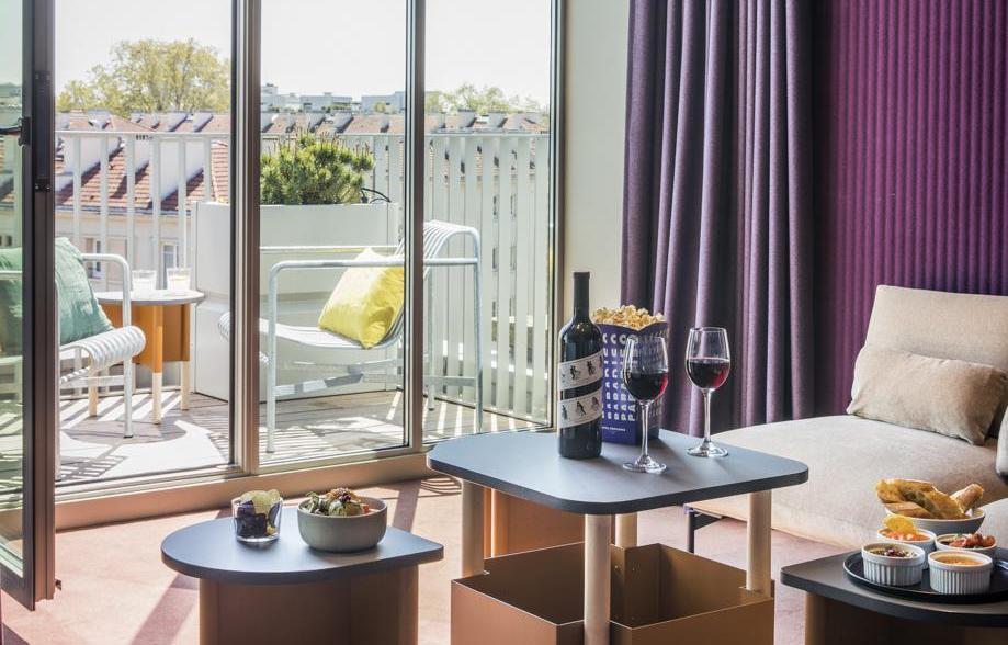 Să ne imaginăm că ne putem relaxa făcând o pauză între plimbările din metropolă chiar în inima orașului, întinși într-o cameră de hotel specială, cu un film bun, iar pe lângă meniurile obișnuite de cinema putem comanda și specialități gourmet, vinuri și șampanii bune! MK2 este condus și deținut de Nathaniel și Elisha Karmitz. MK2 este cea mai mare rețea de cinematografe de artă din Franța, fondată în 1974 de tatăl celor doi. La realizarea hotelului-cinema s-a alăturat și Alix Thomsen, recuzitele și ideile sale evocând atmosfera epocii de aur cinematografice.