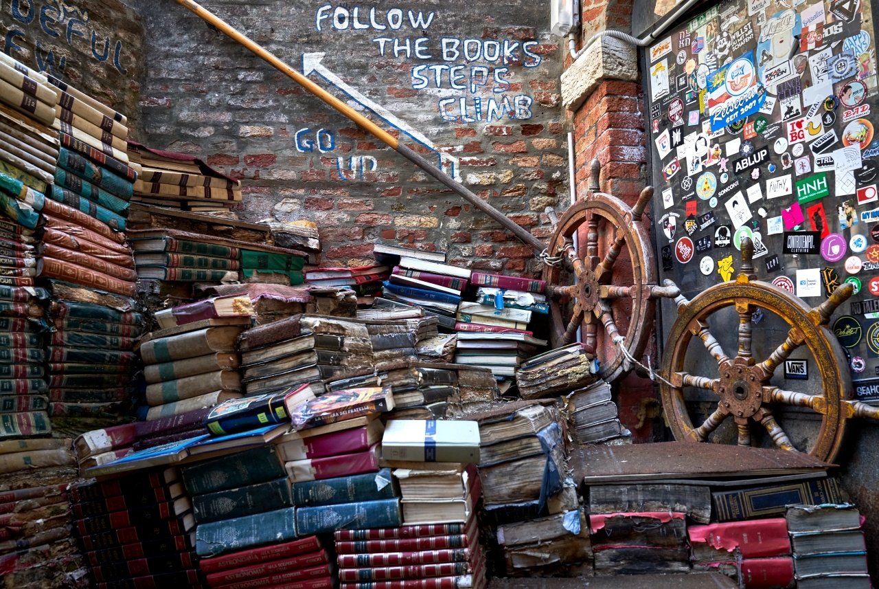 Magazinul aflat la Veneția este probabil singurul în care merită să ne încălțăm cu cizme de cauciuc, deoarece este inundat. Denumirea librăriei înseamnă: librăria inundată. Proprietarii se străduiesc să protejeze clădirea de apă, iar cărțile ude de la intrare sunt pe post de scări.
