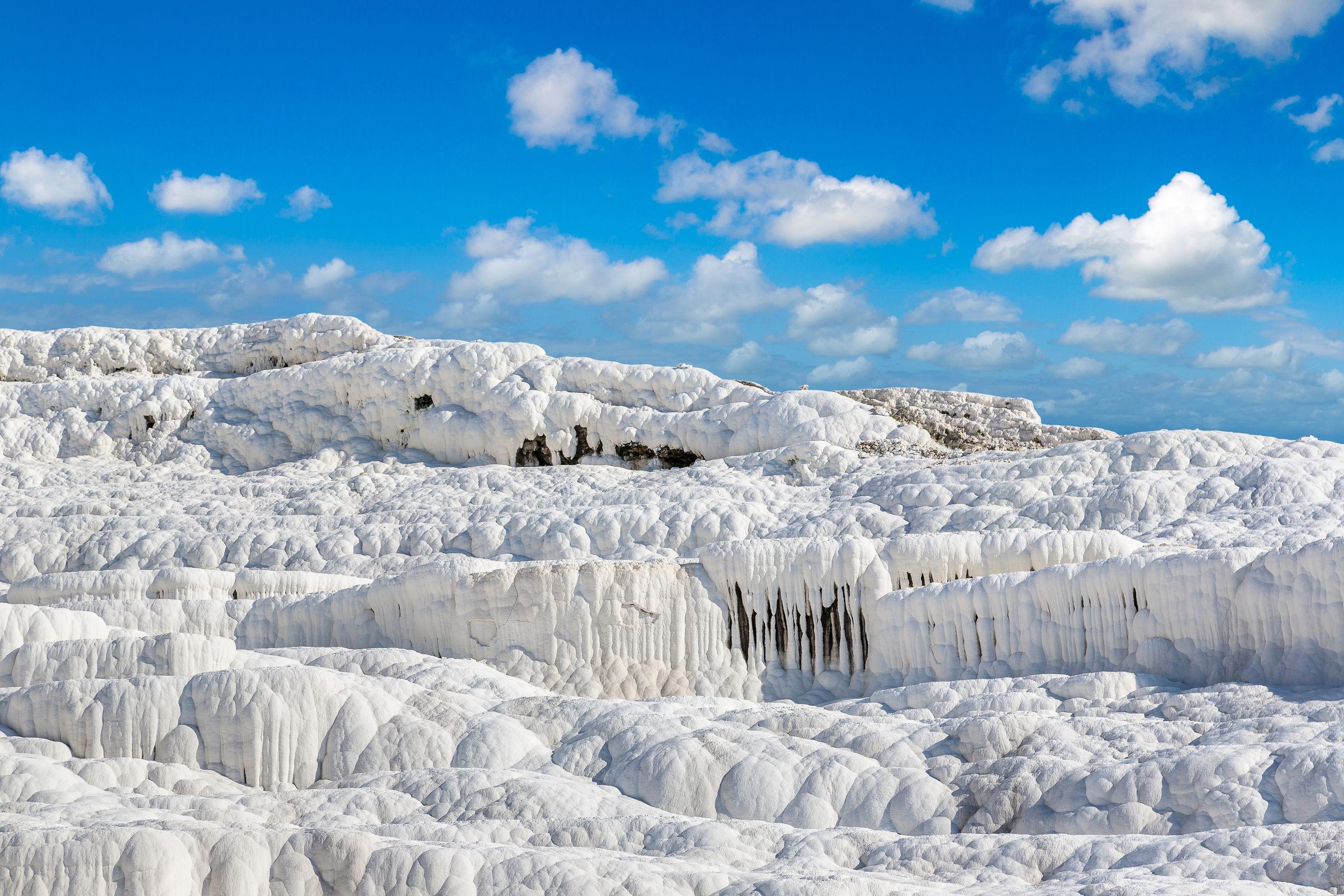 Bazinele de calcar formate pe dealul alb ca zăpada au fost create de apa de izvor de aproximativ 35 de grade ce erupe la suprafață, bogată în bicarbonat de calciu și dioxid de carbon. Încă din antichitate zona a fost vizitată ca stațiune balneară.