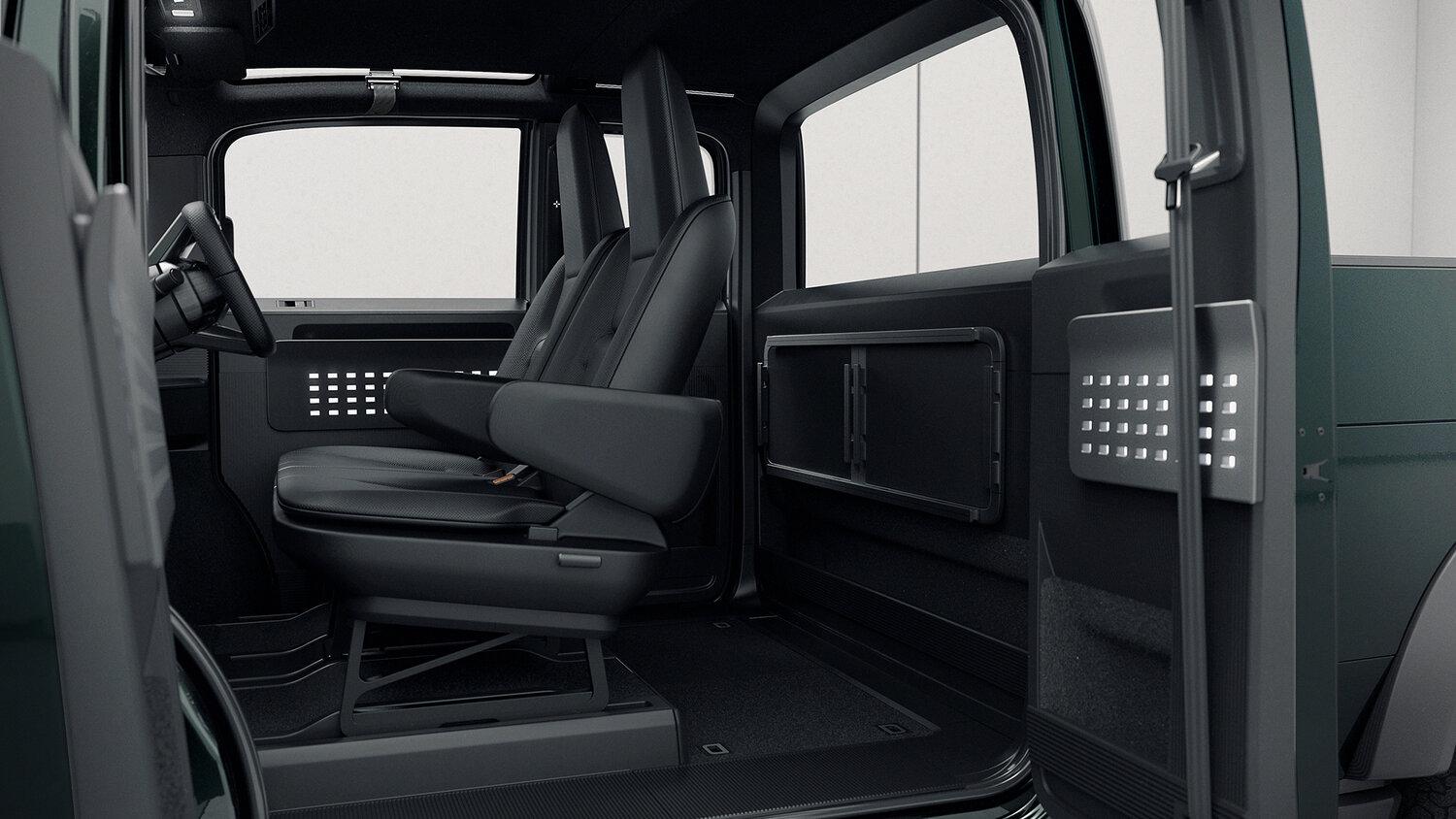 Pasagerii sunt întâmpinați în interior de forme elegante și materiale durabile. În partea din spate a cabinei variabile poate fi plasat un al doilea rând de scaune sau un spațiu de stocare suplimentar, configurat în funcție de nevoile personale. Lungimea de bază de 4.677 mm a vehiculului poate fi crescută și până la 5.400 mm, deoarece datorită unei soluții ingenioase bena poate fi extinsă.