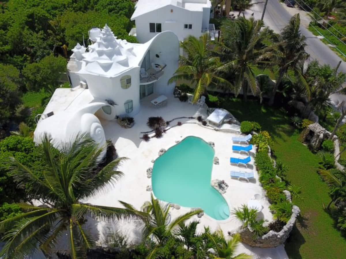 Această vilă de lux în formă de scoică se găsește în Isla Mujeres din Mexic. Cazarea denumită Casa Caracol are 2 dormitoare, fiind ideală pentru o familie de 4 persoane. Este la doar 20 de minute cu mașina de aeroportul din Cancún și este construită pe vârful unei stânci – totul în interior și exterior are formă de scoici.