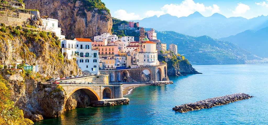 Drumul de 50 km de-a lungul stâncilor Mării Tireniene te duce din peninsula Sorrento până în Salerno. Numit Costiera Amalfitană, drumul se răsucește prin sate celebre în culori pastelate și oferă călătorilor cele mai incredibile vederi de coastă. Începe-ți călătoria în orașul istoric Sorrento, înainte de a conduce de-a lungul coastei până în satul pitoresc de pe stâncă Positano. Continuă-ți călătoria de-a lungul coastei și vizitează orașele Amalfi, Ravello și Vietri Sul Mare.
