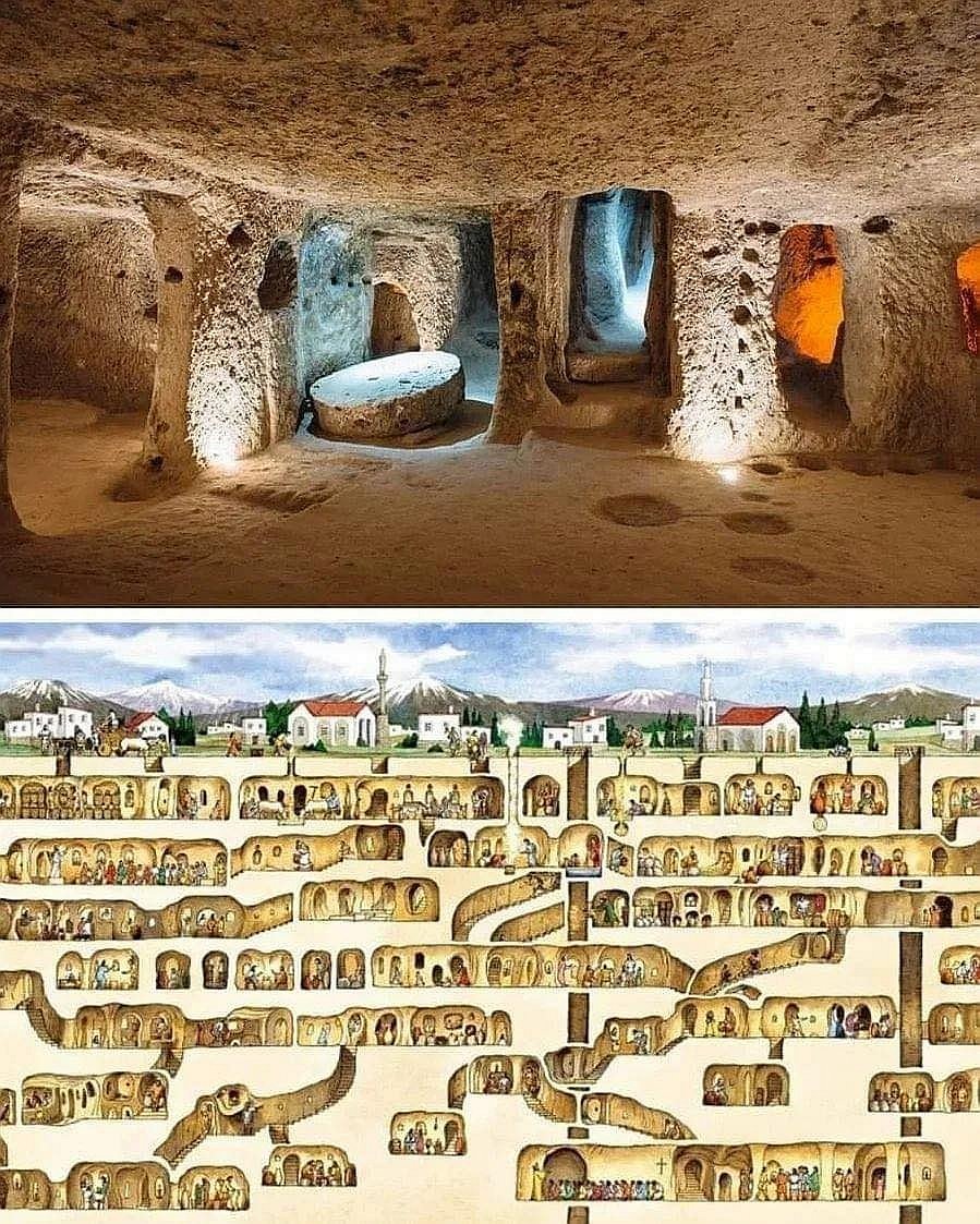 În Cappadocia, mai exact în satul Derinkuyu, se află orașul subteran turcesc cu o istorie de o mie de ani. Cu o rețea complexă de tuneluri care se înșiră pe opt niveluri, această atracție subterană este unică în regiune. Așezarea de sub pământ, care are o adâncime de 85 de metri, a fost cu siguranță construită în trecut pentru a oferi protecție împotriva temperaturilor extreme și pentru a facilita apărarea împotriva intrușilor.
