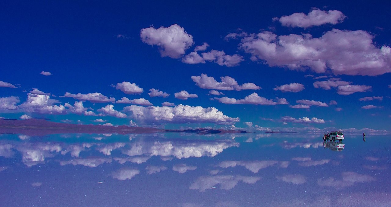 Situat în Anzi, Salar de Uyuni este cea mai mare salină de suprafață din lume situată la cea mai înaltă altitudine. Fundul uscat al lacului se întinde pe 10,5 mii de km² și trebuie să urci până la 3.656 de metri deasupra nivelului mării pentru a-l vedea. Mlaștina sărată este de obicei uscată, dar periodic este acoperită de câțiva centimetri de apă, creeând o iluzie senzorială ca în imaginea alăturată.