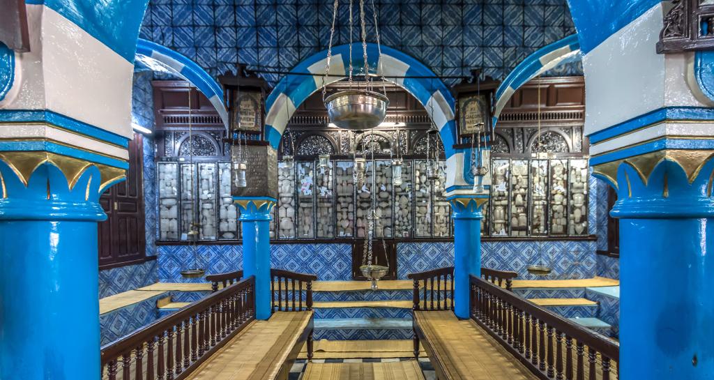 Pereții sinagogii sunt acoperiți cu plăci cu modele colorate, în stil maur. În mijlocul sanctuarului se află o platformă de lectură tora sculptată artistic – aici se păstrează cea mai veche Tora din lume, scrisă pe piele de gazelă. Potrivit legendei, a fost salvată și adusă aici în 586 î. Hr., când templul din Ierusalim a fost distrus.