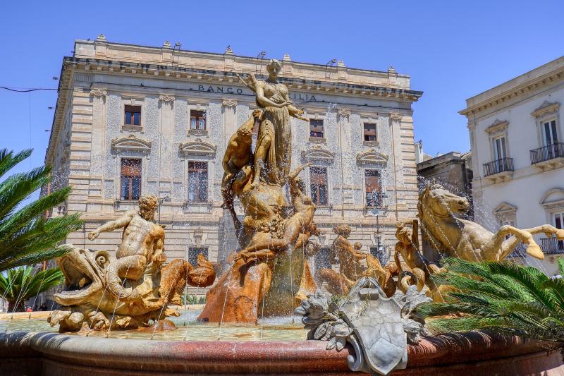 Desigur, nu din acest motiv a intrat în Patrimoniul Mondial centrul antic al orașului, Ortigia, având o locație cu adevărat unică, cu câteva poduri către insula din vârful peninsulei. Deși toate culturile care s-au așezat aici din cele mai vechi timpuri și-au pus amprenta asupra ei, mult mai puține dintre ele au supraviețuit din cauza a două cutremure, după care centrul istoric al orașului a fost reconstruit în stil baroc. Din fericire, templul lui Apollo, fântâna Arethusei, clădirea teatrului antic, iar lângă ea cariera cu peștera numită Urechile lui Dionysios, amfiteatrul, respectiv catedrala construită în secolul al VII-lea au supraviețuit dezastrelor, așa că orașul este o mină de aur și pentru fanii de antichități.