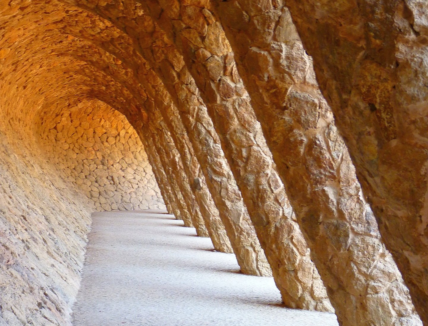 Drumurile din jurul parcului au fost proiectate de Gaudí, ca nişte structuri care ies din versantul abrupt al dealului sau rulează pe viaducte, cu poteci separate în arcade formate sub aceste structuri. Drumurile şerpuiesc ca râurile, străjuite de coloane ondulate şi uşor înclinate sau stalactite în formă de copac, caverne, conferind o senzaţie de mişcare constantă.