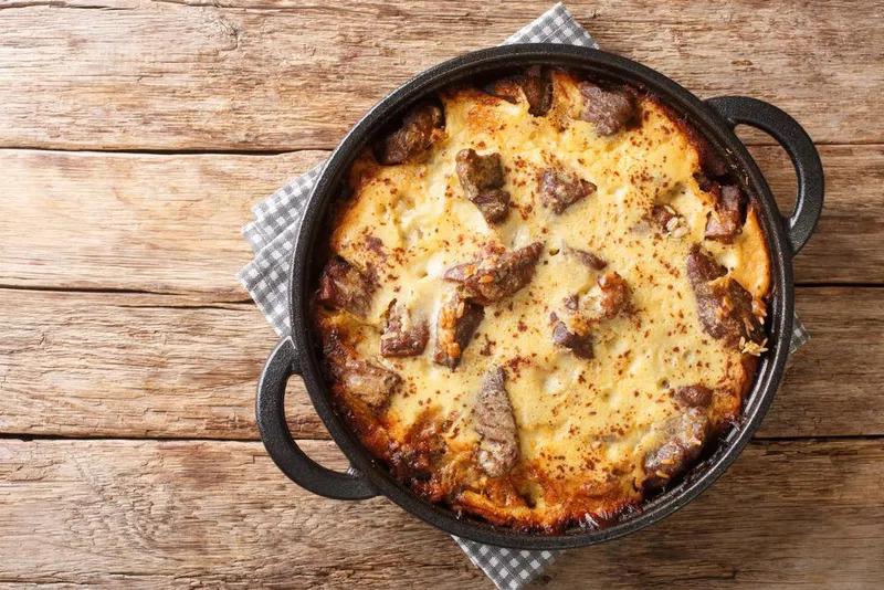 Tave dheu me mish vine preparat într-o oală de lut. Conține carne, brânză, cașcaval, roșii, fiind un adevărat fel de mâncare hrănitor, care încălzește sufletul.