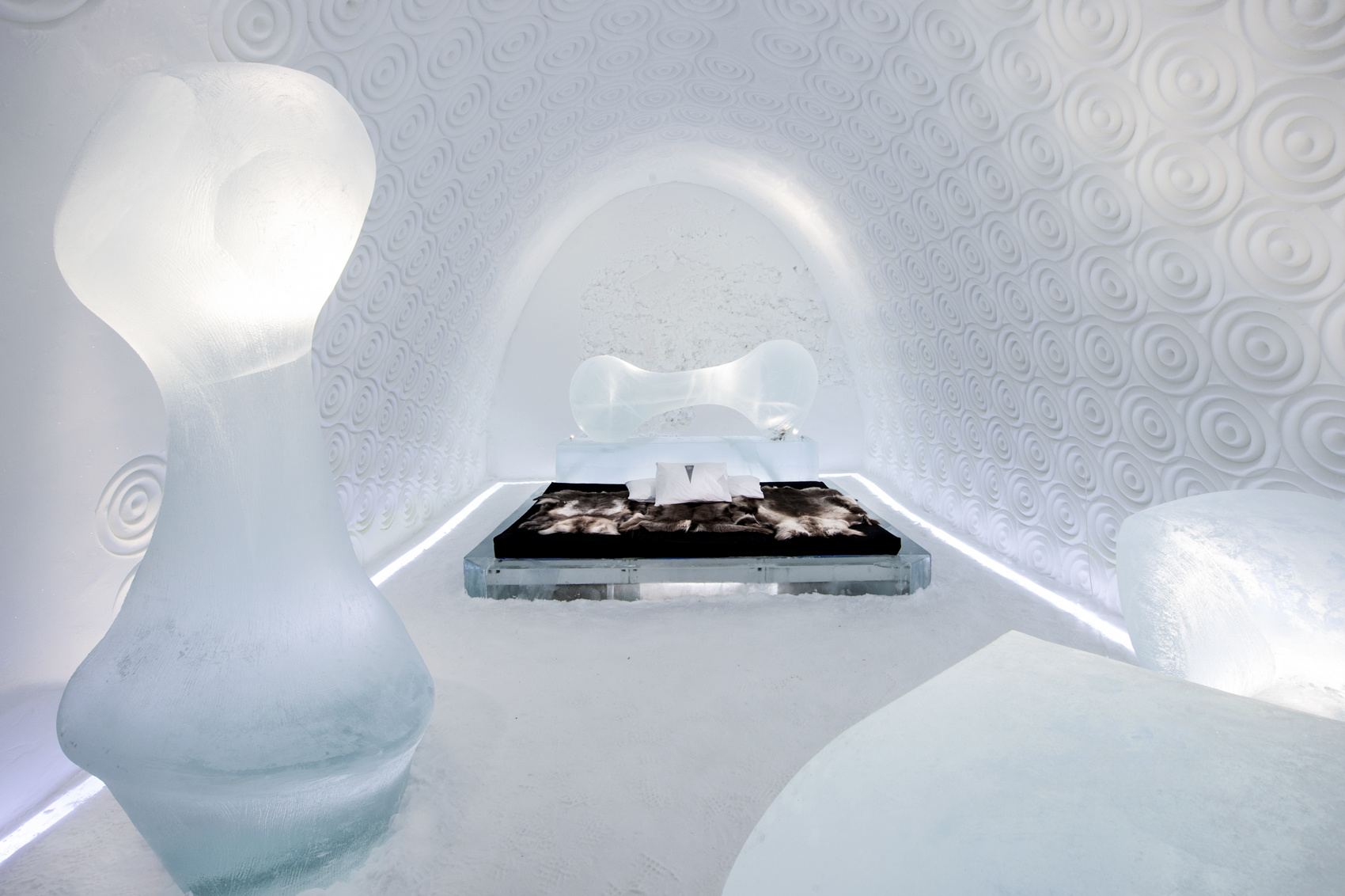 A világ legészakibb jéghoteléhez kápolna is tartozik, így egyben különleges esküvői helyszín. Az ágyakat rénszarvasprémmel terítik be, amelyek egészen -30 celsius fokos külső hőmérsékletig komfortossá teszik az ülő- és fekvőhelyeket. Ezzel együtt felmelegedhetünk a jégkunyhók mellé épített szaunákban is.