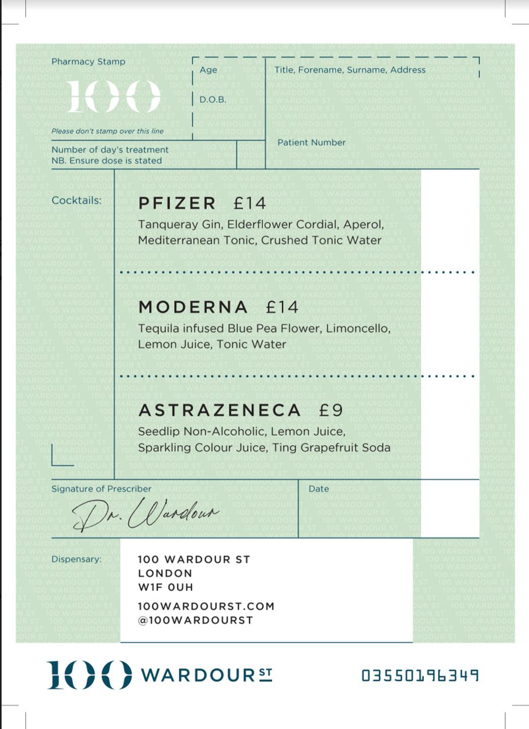 A 100 Wardour St. itallapja oltási lapra emlékeztet, a koktélokat pedig úgy állították össze, hogy azon korosztály ízlésének feleljenek meg, amely az adott oltást kapta Angliában.