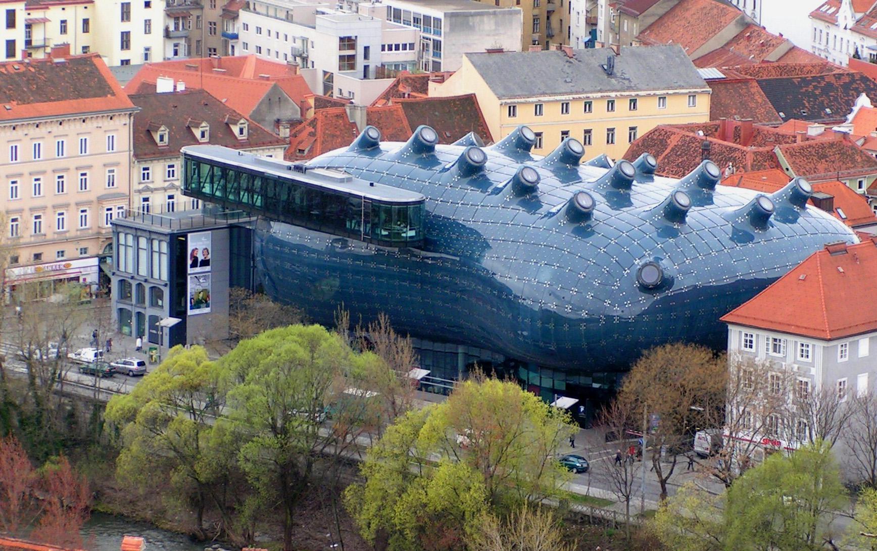A Kunsthaus Graz, azaz a kortárs művészeti múzeum meghökkentő épületét 2003-ban adták át, és amilyen egyedi a külseje, olyan különlegesek modern kiállításai is. A fényes üvegfelület alá 1000, napenergiával működő fénycsövet építettek be, amelyek különböző mintákat adnak ki a sötétben.
