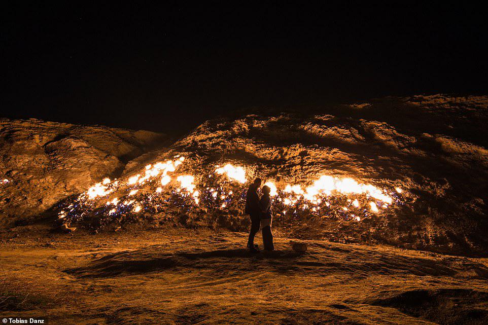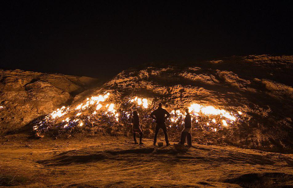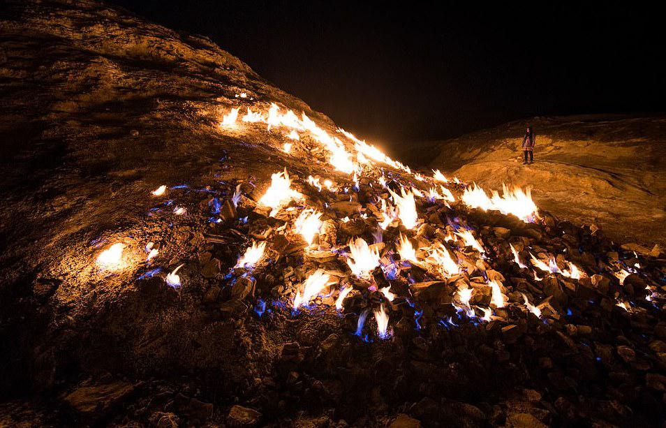 A nyugat-iráni hegy Huzisztán tartomány egyik legnépszerűbb természeti látványossága. Na de mitől is ég megszakítás nélkül? A jelenség mögött egyszerű geológiai folyamat áll. A porózus homokkőhegy rétegei között folyamatosan szivárog a kéngáz, a lángokat ráadásul a domboldalt beterítő szerves anyagok is folyamatosan táplálják. A legtöbb turista azonban nem csak a látvány miatt látogat el a Firing Mounthoz, azaz a tüzes hegyhez: társasági eseményként itt grilleznek, partiznak, hiszen a jelenség éjszaka a leglátványosabb.