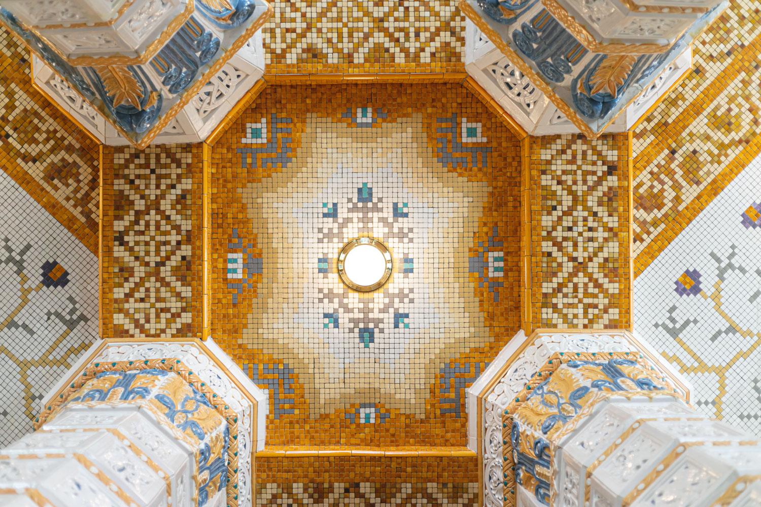 A morva stílusú borozót szőlőmintázatú csempe borítja, a Topaz szalonban pedig egy műemléki védettségű facsempe-mozaikot csodálhatunk meg. Az üvegtetős Diamond szalon falainak eredeti szecessziós kerámiadíszítése és a mozaikos mennyezetek mesebeli hangulatot teremtenek, amit a nyüzsgő utcára néző nagy ablakok csak tovább fokoznak.