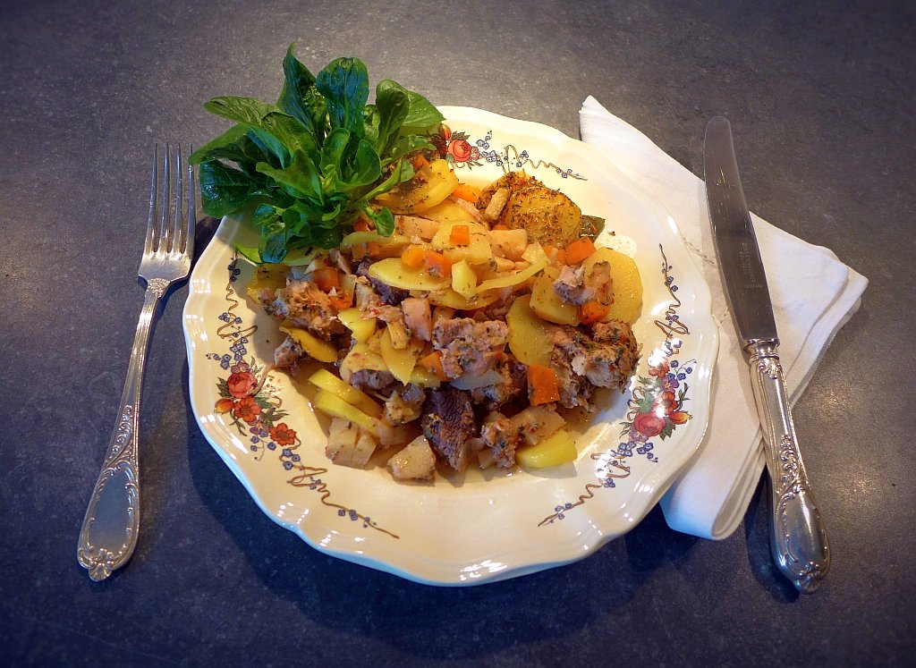 A mi pörköltünkre hasonlító elzászi fogásba sertés-, juh- és marhahús is kerül, répával, póréhagymával és fehérborral ízesítve. Az egy egész éjszakán át pácolt húst burgonyarétegek közé helyezik egy terrakotta edényben, majd hosszú órákon át sütik.