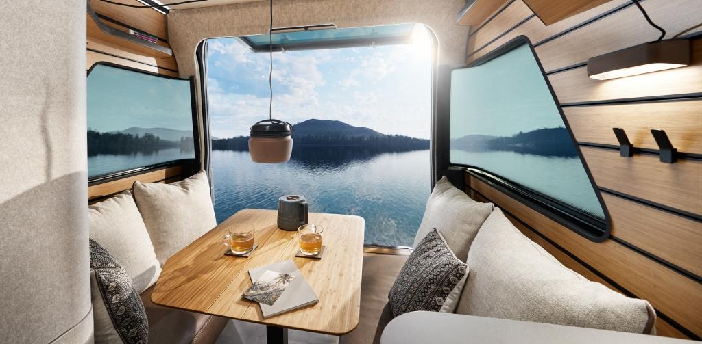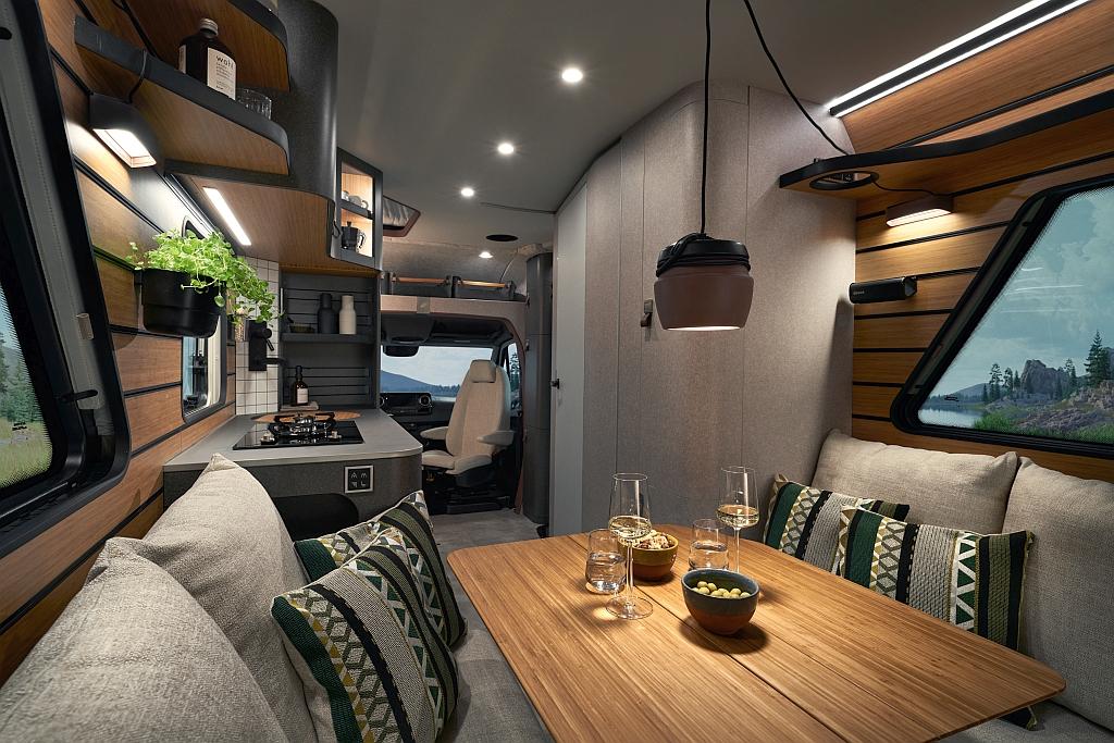 A kényelmes kanapéhoz kemény bambuszból készült, összehajtható asztal jár, a konyharész matt fekete fényezést kapott, a multifunkcionális szekrényfal polcait, fiókjait és rekeszeit mindenki a saját igényei szerint alakíthatja ki. A két irányban nyíló hátsó rész alsó ajtaja napközben verandaként szolgál, a WC és a mosdó egy mozgatható fallal zuhanyzóvá bővíthető, míg az anyósülést megfordítva a falból kihajtható munkaállomást kapunk.