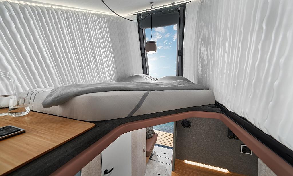 A napelemekkel szerelt, gombnyomásra felemelkedő campertető alatt két fekhelyet találunk, amelyeket beépített lépcsősoron közelíthetünk meg. A hálórész oldalfalát képező, méhsejtszerkezetű anyag 7 centiméter vastag, állja az esőt és a szelet, különösen jól szigetel. A beltérben 6 darab, 230 voltos konnektor és 8 USB-csatlakozó található.