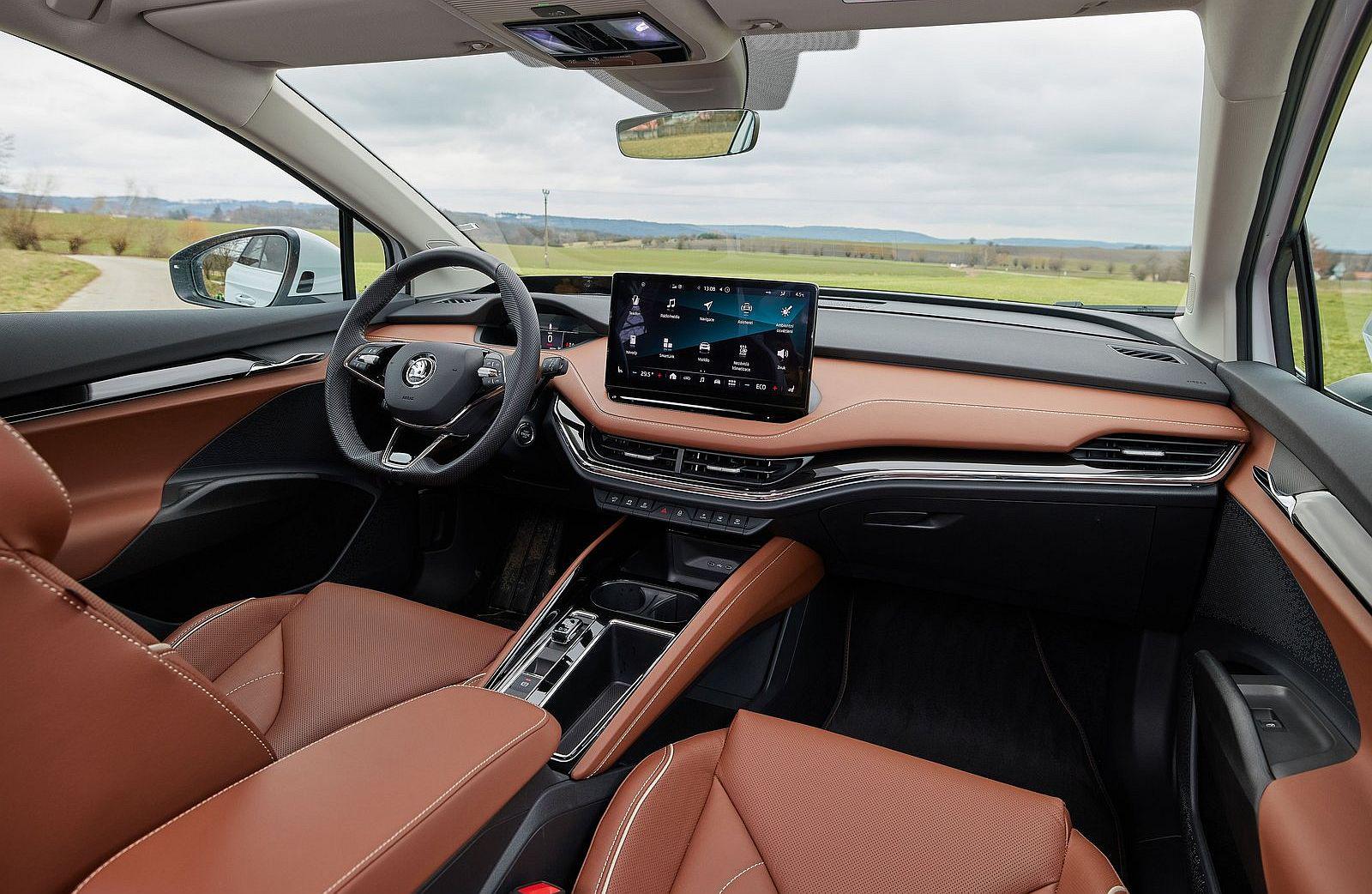Az utastérben jól megfér egymással a hagyomány és a jövő technológiája. Ne számítsunk űrhajós dizájnra sci-fi kijelzőkkel, ám a klasszikus műszerfal így is szinte teljesen eltűnt. A kormány mögött egy kisebb digitális műszeregység nyújt tájékoztatást a vezetőnek, de a legfontosabb adatok, illetve a navigációs utasítások a szélvédőre kivetítve, egy head-up kijelzőn is láthatók. A belső világítás szintén a prémiumkategóriát idézi, az infotainment rendszert pedig 13 colos központi képernyőről irányíthatjuk. Az összeszerelés minősége és az anyagválasztás jóval nevesebb márkákat idéz, ebből a szempontból az Enyaq túlmutat a Škodától megszokott kereteken. Ráadásul már alapáron is jelentős számú belső szín- és anyagkombináció áll rendelkezésre.