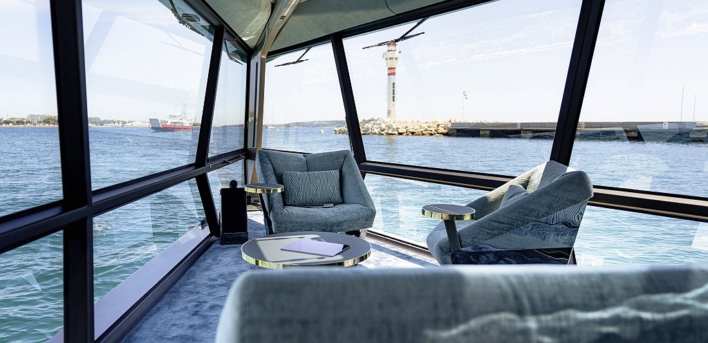 Szögletes üvegajtók engednek belépést a lounge hangulatú belső térbe, ahol a luxus szőnyegborítás és a műalkotásként megformált bútorok harmóniája kaleidoszkópszerű élményt ígér. Minden egyes darabot nemes fémlemezből formáltak meg, amelyek szemcsés felületi kialakítása úgy veri vissza a szőnyegre a napfényt, mint a tenger hullámai. Az élmény középpontjában a 360° fokban forduló ülések állnak, amelytől az alkotók mindent karnyújtásnyi távolságra helyeztek el – még a táblagép-alapú szórakoztató- és információ-szolgáltató rendszert is.