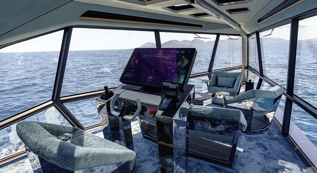 A THE ICON kényelmes lounge hangulata így bármelyik kikötőt otthonossá varázsolja. A vezérlőállás a fedélzet közepén kapott helyet. A 6K felbontású, 32 colos digitális felület a BMW iDrive járművezérlő technológia működési modelljét idézi, így az olyan fontos információk, mint például az aktuális hatótávolság vagy az időjárás-előrejelzés, hangvezérléssel is előhívhatók.