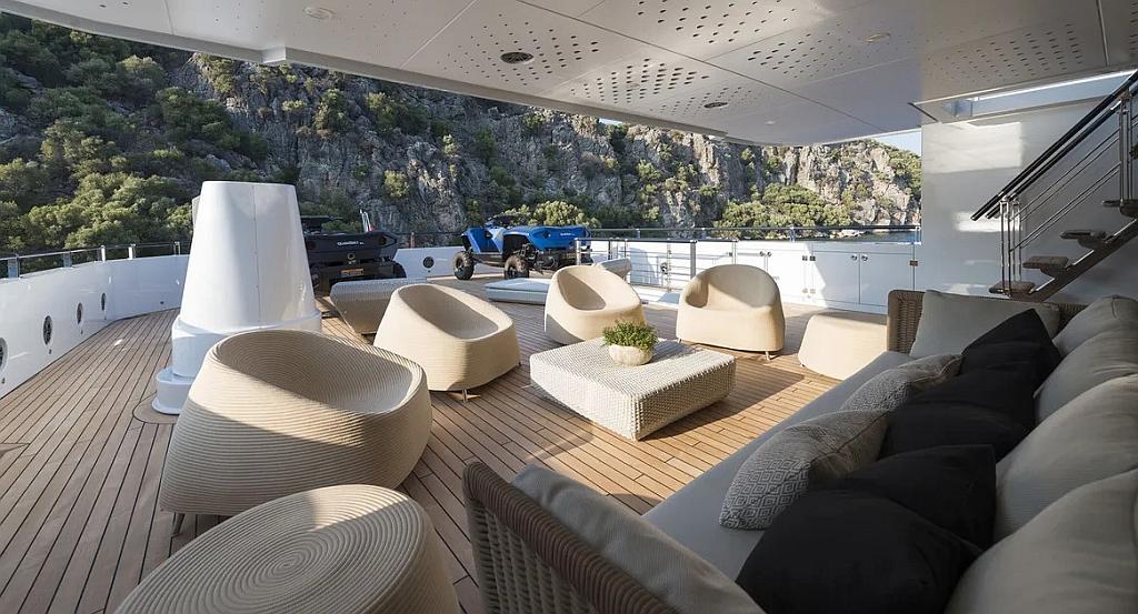 A tágas luxusjachtjó összesen tíz utasnak kínál helyet. Egy kétszemélyes kabin, három lakosztály és egy teljes szint (óriási hálószobával, irodával és két erkéllyel) mellett jakuzzi és klubrész várja a nyaralni vágyókat. A fedélzeten számos sporteszköz és készülék is helyet kapott.