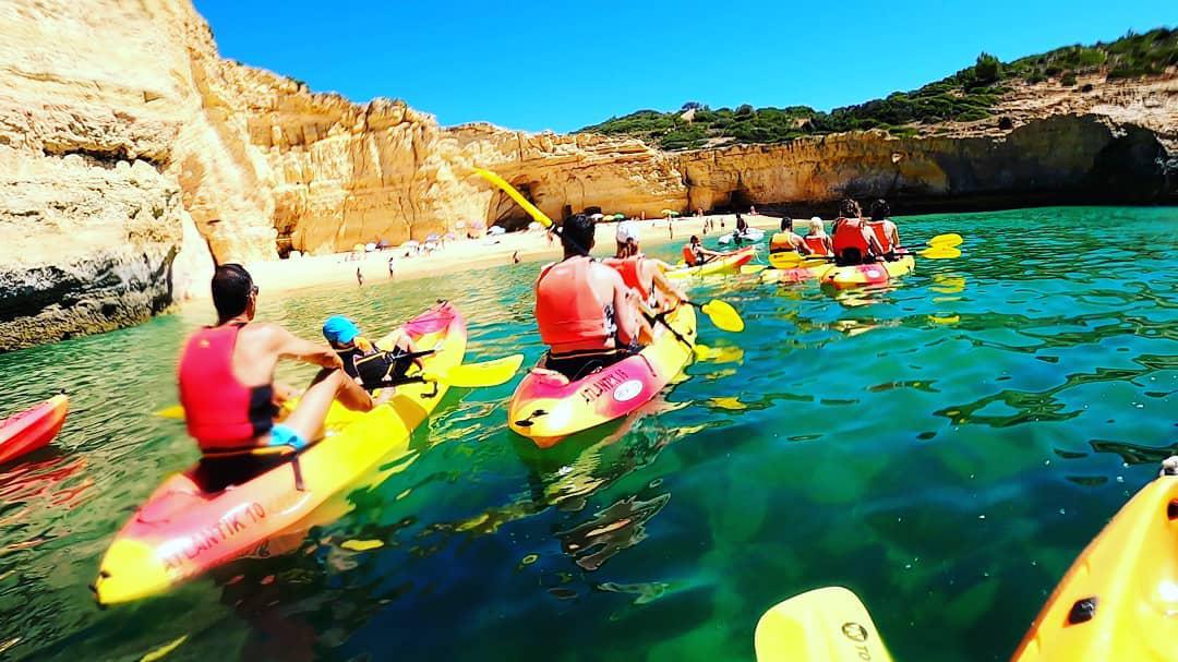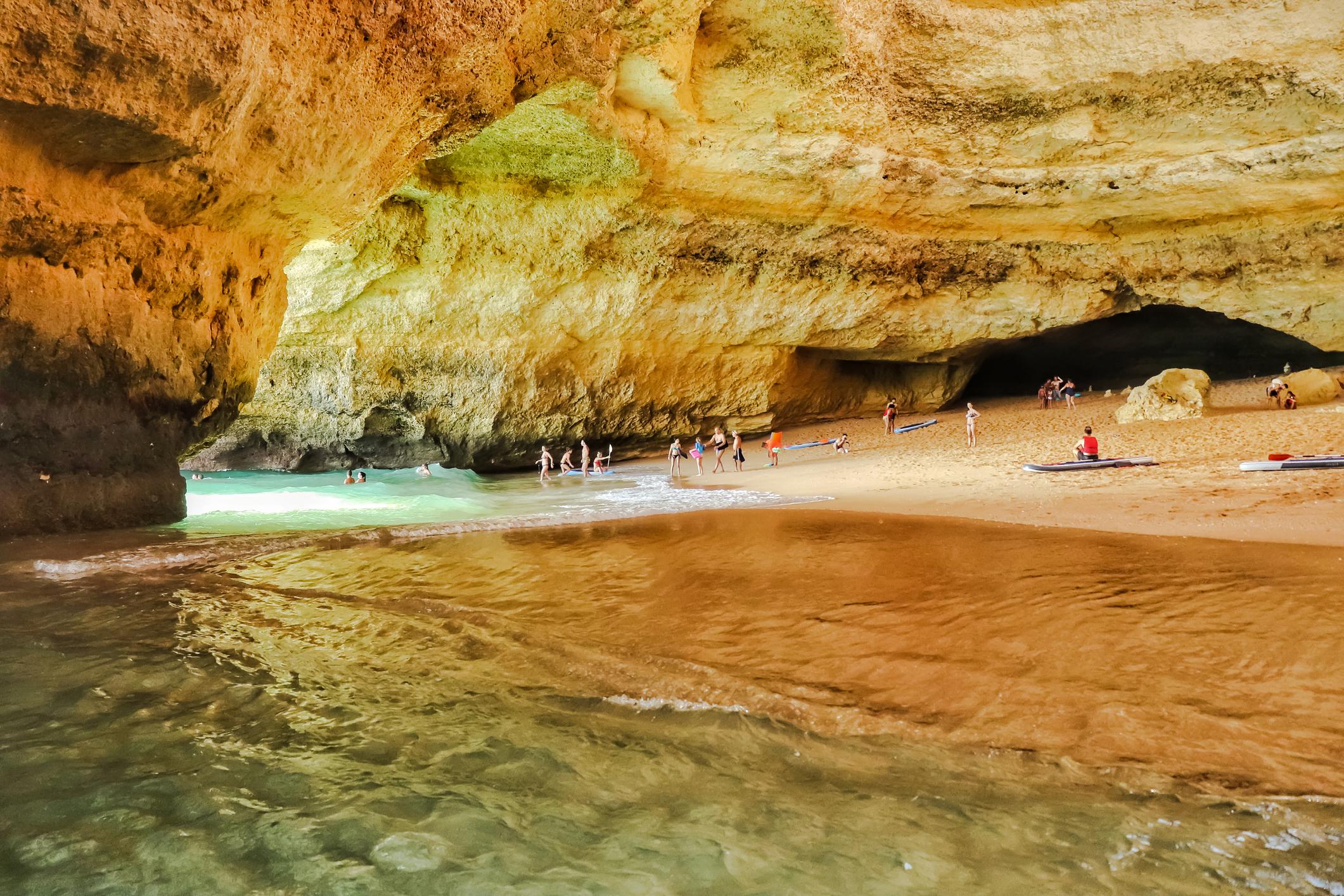 A Benagil-barlang környékén számos homokos strand található, így nem nehéz megtalálni a kedvenc partunkat és onnan egyénileg vagy csoportos, vezetett túrán beevezni a barlangokba. A mentőmellény viselése minden esetben ajánlott, akár motorcsónakra fizetünk be, akár kajakozunk, SUP-ozunk, mert az óceán sokkal vadabb is tud lenni, mint ahogy a képeken tűnik. Emiatt semmiképpen se vállalkozzunk arra, hogy elússzunk a barlangig, mert az áramlás ezen a területen nagyon erős lehet. Ha biztonságosan szeretnénk élvezni a barlangot, akkor a legjobb, ha a sok hajó egyikére veszünk jegyet, ami bevisz a barlangokig, de kajakot, csónakot és SUP-ot is több helyen bérelhetünk.