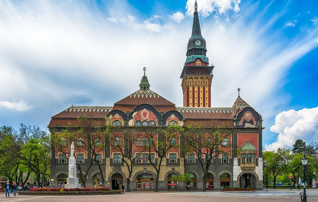 Szabadka központjában található a magyar szecesszió egyik tündöklő ékköve, az 1908 és 1910 között épült városháza. Tornya 76 méter magas, a 45,5 méter magasan található kilátóból páratlan panoráma nyílik a városra és környékére. A szimmetrikus alapú épületnek négy belső udvara és négy bejárata van. Az északi oldalon egy szép, rendezett parkban található a Kék-szökőkút, valamint egy előcsarnok, melynek emeletén három díszterem van – köztük a városháza szívét jelentő Nagy díszterem. Itt tartják a képviselő-testület üléseit, koncerteket, esküvőket. Gyönyörű ólomüvegei különlegesen értékes műalkotások.