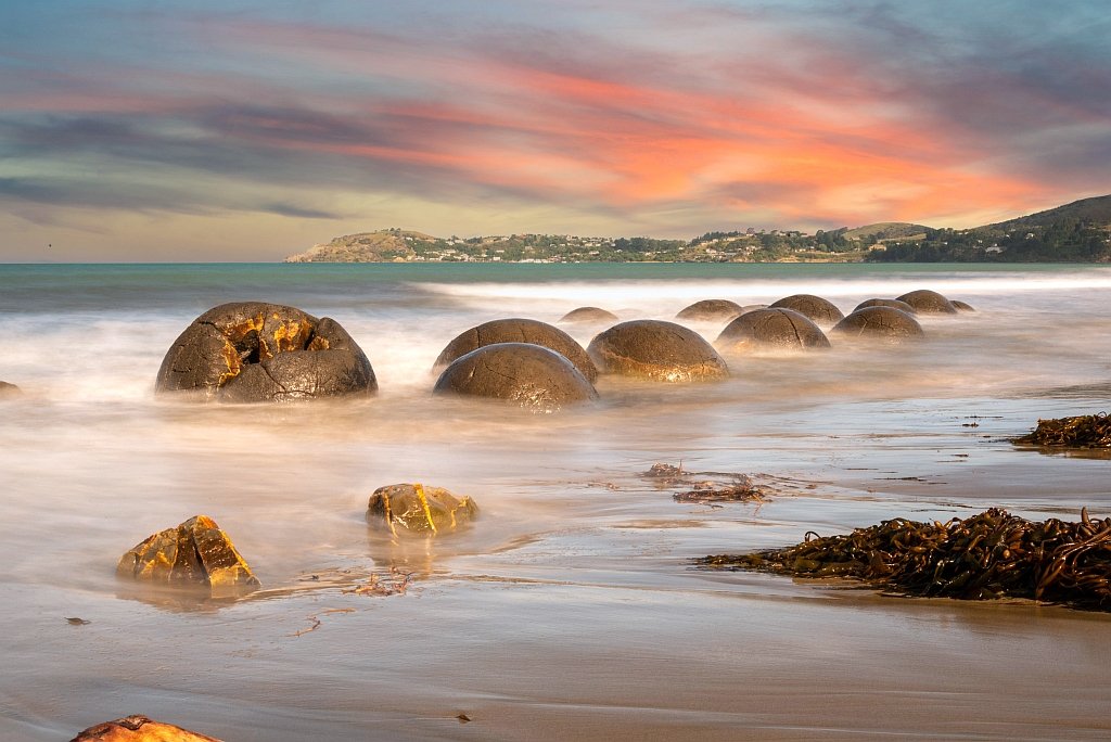Az Otago régióban, Új-Zéland déli szigetének keleti partján húzódó strandot mintha sárkányok formálták volna. A Koekohe tengerpart több tonnás, két méteres magasságot is elérő szabályos sziklagömbjei a tudósok szerint 65 millió éve, karbonátok héjas kristályosodásával keletkeztek, a maori legenda viszont egy ezer éve történt hajótörésből származó edényeknek tartja a népszerű turistalátványosságot.