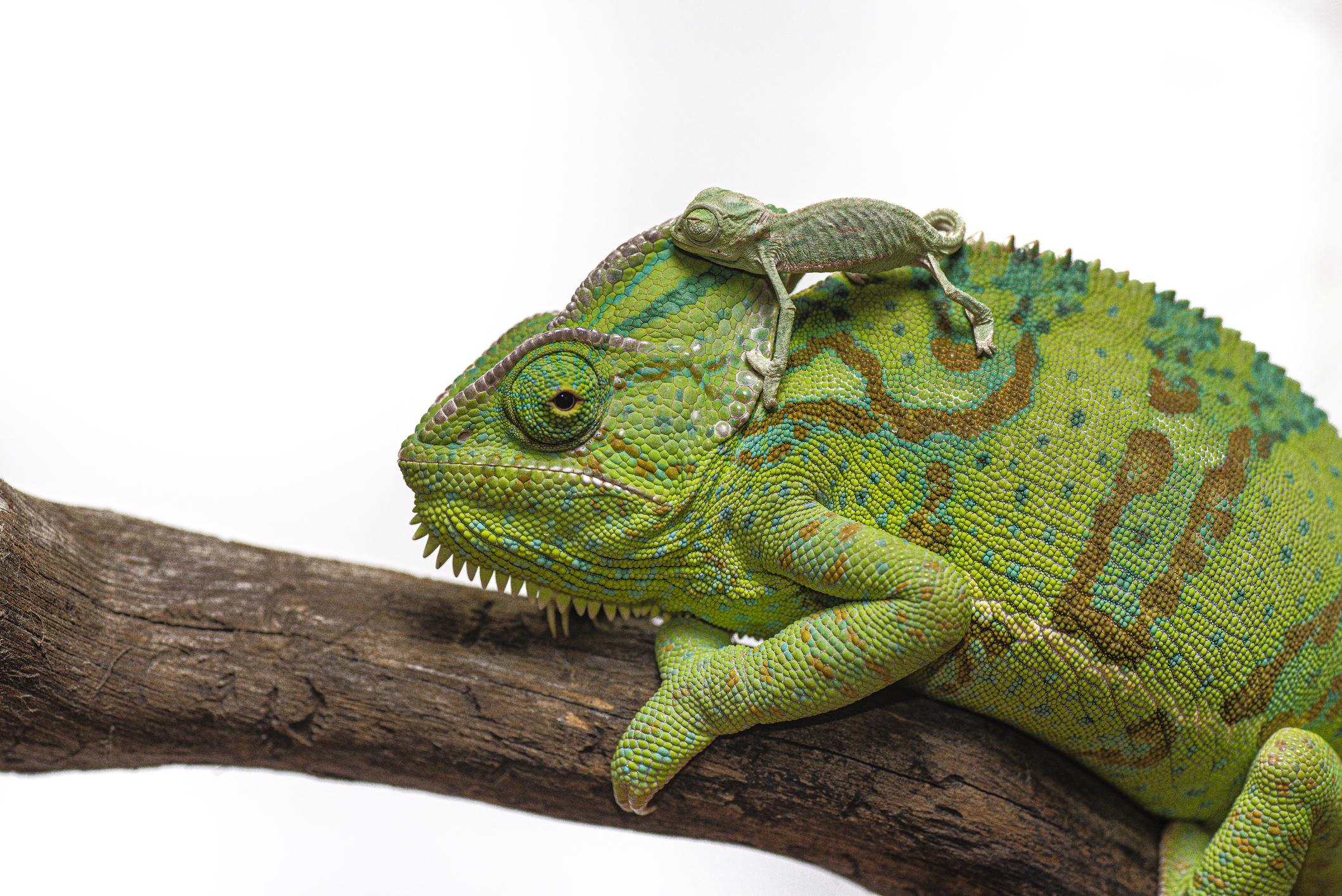 A fátyolos kaméleon néven is ismert, kb. 60 centis hüllőnek az alapszíne zöld, kék, barna sárga csíkokkal tarkítva, azonban hangulatának megfelelően megváltoztathatja a színét. Idegrendszere üzenetet küld a bőrében található pigmenttartalmú kromatofor sejteknek, hogy táguljanak vagy összehúzódjanak.