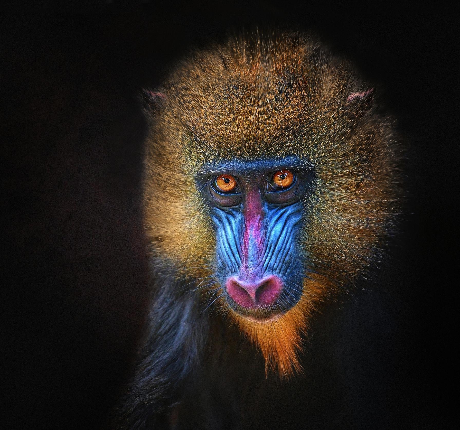 A páviánok közeli rokona. Mára nagyon kevés maradt belőlük, mert amellett, hogy csökken a természetes élőhelyük, még vadásznak is rájuk. Az egyenlítői Afrikában honos állat kék-vörös foltjai még élénkebbé válnak, amikor izgatott.