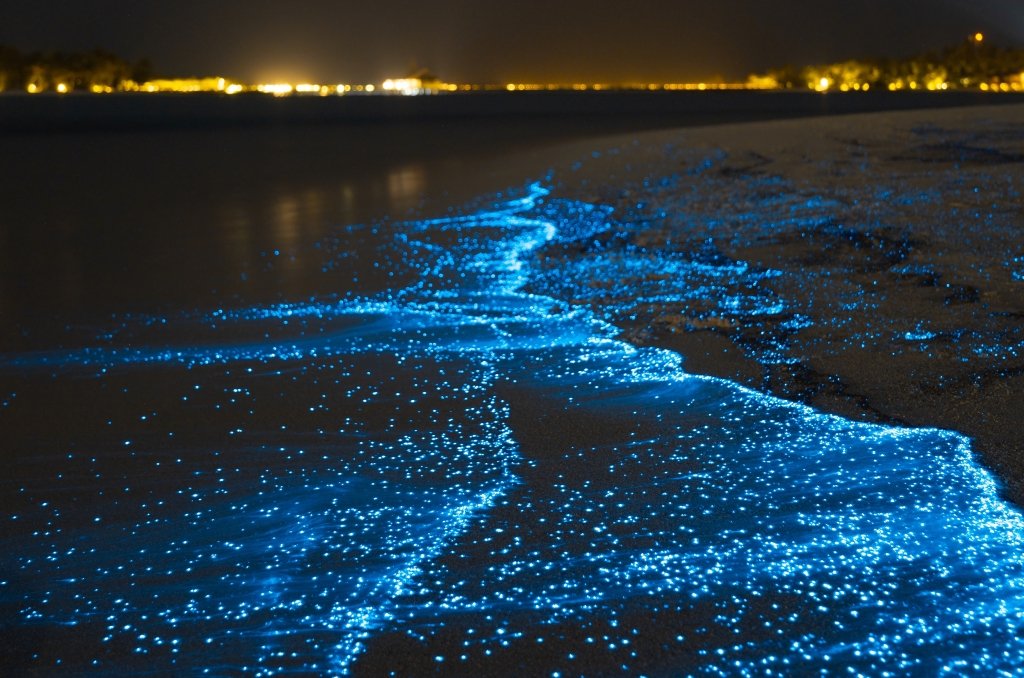 În largul coastelor Maldivelor, oceanul strălucește albastru în întuneric, dând impresia că stelele au căzut de pe cer și s-au scufundat sub apă. De-a lungul țărmului, mai multe pete minuscule asemănătoare unor stele sunt aduse de valuri, luminând nisipul umed ca și cum ar fi reflexii ale cerului de noapte. Mulți călători caută această priveliște fosforescentă în Maldive.